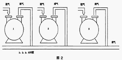 第二,多臺水環(huán)泵不采用排氣管道串并聯(lián)使用(如圖2),我公司目前多處使用該連接方式,而是采用單臺泵單用排氣管。 |